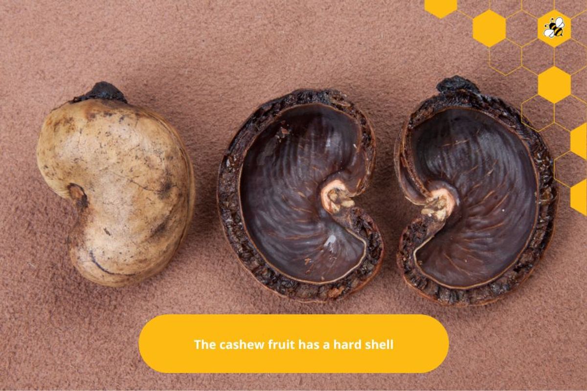 The cashew fruit has a hard shell, concave eyes, and a pear-shaped stalk. Inside the shell is the cashew nut, covered by a thin, brown shell. Cashew nuts are delicious and have high nutritional value, containing lots of fat, protein, vitamins, and minerals.