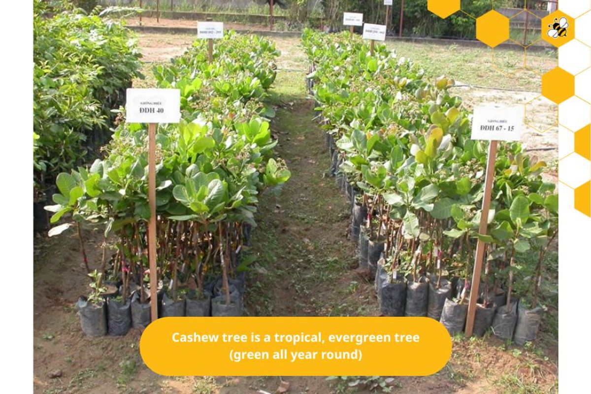 The cashew tree is a tropical, evergreen tree (green all year round).